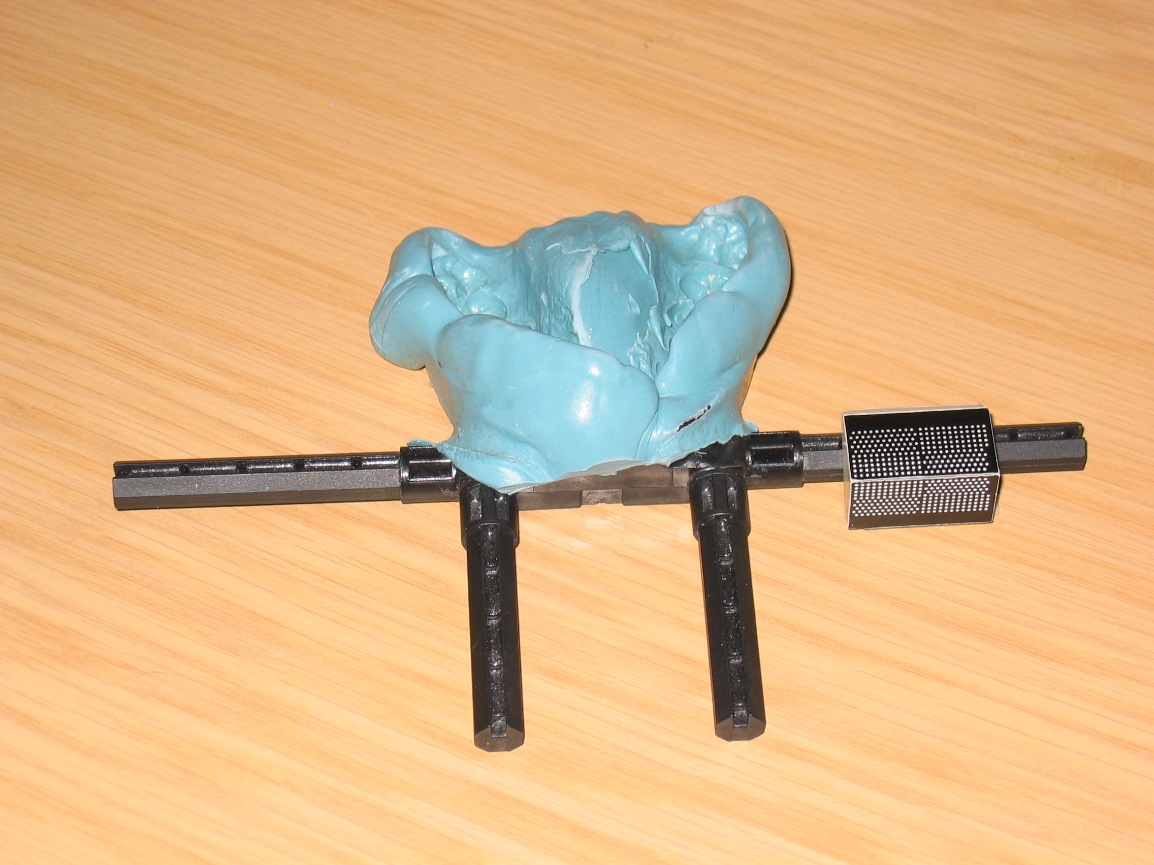 Augmented Reality (AR) applications typically involve a real space and a virtual space which should be co-registered. Both spaces have an 'observer' usually in the form of some camera system. In the real space our 'camera' is typically the surgical microscope's optical system or an endoscope's optical element. The virtual space is a 'computer graphics'space - e.g. implemented in C++ with OpenGL - with a 'virtual' camera. The calibration step aims to align the real camera and the virtual camera. This alignment requires the knowledge of six extrinsic parameters and five intrinsic parameters. The extrinsic parameters are the six spatial degrees of freedom (dof's), i.e. three for position (translational dof's) and three for orientation (rotational dof's). The intrinsic parameters are the effective focal length, the optical center (2 parameters in x,y), the scale factor and the first order radial distortion factor (second order radial distortion can be ignored in most practical cases). Several calibration algorithms have been designed for this purpose. We used a modified version of the well-established Tsai's calibration algorithm. To perform calibration, a mouthpiece (VBH - Vogele Bale Hohner) with calibration pattern is inserted in the patient's mouth (see left image below). A virtual counterpart of this pattern exists in the virtual space. A snapshot of a phantom with mounted calibration device (flat pattern) is shown below (middle image below). The dot pattern is segmented and image coordinates of the dots on the real image are matched with their real world coordinates. This is sufficient to derive the eleven parameters, hence to define the pose of the camera. Errors on calibration are of sub-pixel level, provided the object is at an angle of inclination of at least 45 degrees. The right image below shows an overlay of the virtual and real calibration object (roof-shaped).