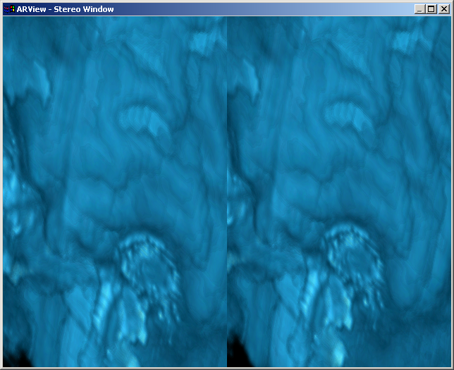 Once we have the real and virtual camera calibrated, we need to register the virtual image data with the real image to obtain an augmented reality overlay. To do so, we pre-operatively scan the patient with the real calibration object so we obtain an additional virtual calibration object. If we match the calibrated patterned virtual object with the scanned virtual object, we will have registered the patient data with the current real image (showing the real calibration object/pattern). We employed a modified Iterative Closest Point (ICP) algorithm to match the scanned and virtual calibration object. The figure below show overlays for a a surgical stereo microscope.