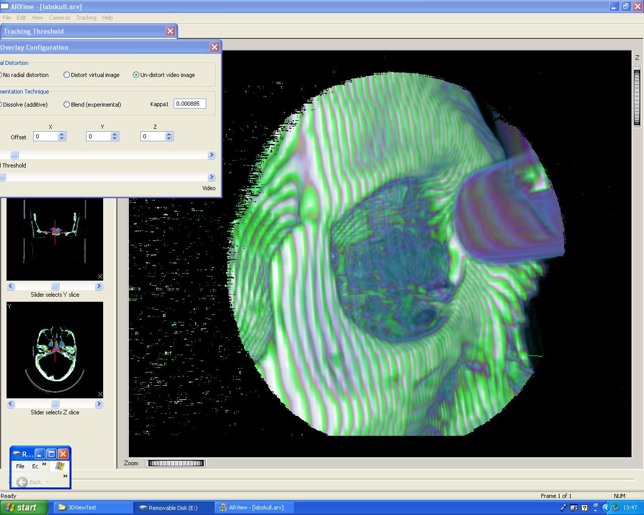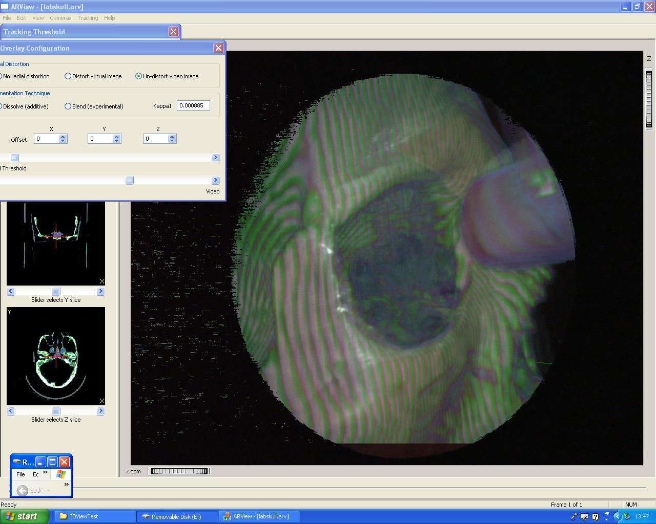 The calibration and registration steps create a static overlay between virtual and real image. We aim to keep the patient motionless, however, the visualisation devices such as the endoscope or microscope plus any additional surgical tools are moved, Hence once a static overlay is obtained, tracking is necessary for dynamic updates. We currently use the Northern Digital (NDI) Polaris optical tracking device. The static accuracy of the device is around 0.5mm RMS. This implies that the overlay error in the long run will get worse as tracking errors cumulate. The images below show an overlay whilst using a rigid endoscope. The overlay error is still within 2-3mm (worst case) after a number of motions within the working volume.