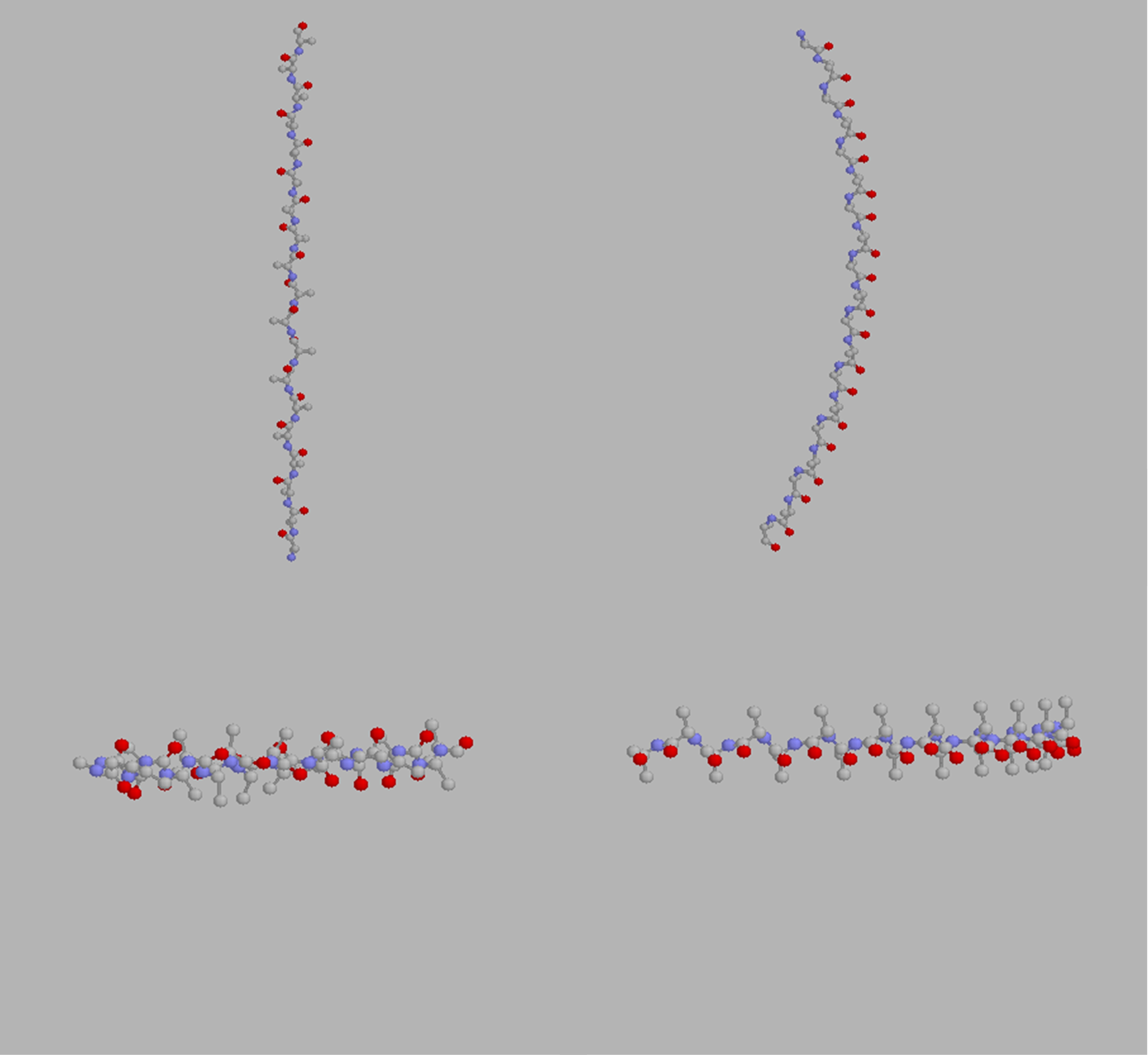 Although the structure of the beta-sheet is well known the structure of the alpha-sheet has not be described in any detail. For the beta-sheet the individual strands are tightly twisted but straight. We calculated the helical properties of the alpha-sheet strand and found it to be radically different to that of the beta-sheet strand. In contrast to beta-sheet the alpha-sheet strand forms a curved structure[10]. Therefore unlike beta-sheet the strands do not need to coil in order to maintain interstrand hydrogen bonding. This may mean the alpha-sheet can form quite flat sheets.